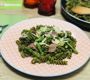 Tortis au moringa, asperges, jambon sec et parmesan
