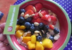 Prendre un grand bol, y mettre le mélange précédent dans le fond, disposer les fruits sur le dessus, mettre du miel et finir par les amandes.