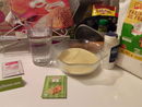 Mélanger le tout et verser dans un blender/robot. Mixer environ 5 min. Ajouter la levure chimique et mixer 1 seconde fois quelques min (on verra apparaître des bulles sur la surface de la pâte ). Laisser reposer minimum 30 min (2 h pour moi).