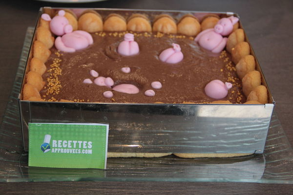 Très bon gâteau, la mousse est légère, j'ai eu un peu peur en retirant le cercle mais finalement tout a bien tenu. Aussi bon que beau ces petits cochons dans leur bain de boue !!
