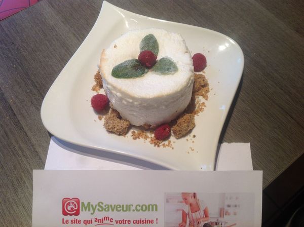 Dressage : mettre le blanc-manger au centre de l'assiette. (Pour le démouler il suffit de faire le tour de l'emporte-pièces à l'aide d'un couteau mouillé). Mettre du crumble tout au tour en jouant avec les grosseurs, (ajouter des framboises fraîches), et déposer les feuilles de menthe cristallisées par dessus avec une framboise.