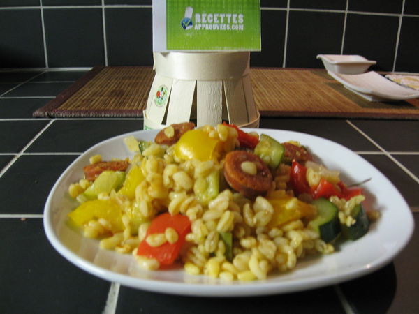 Recette approuvée à la maison, nous avons bien aimé ce plat à base de blé, nouveauté pour nous car c'est un produit que je n'ai pas l'habitude de cuisiner. J'ai utilisé les légumes de mon frigo, carottes, poivron rouge et courgettes que j'avais congelées cet été.