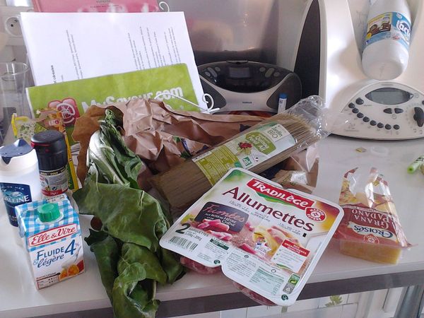 Dans la casserole d'eau, mettre les cotes de blettes à cuire pendant environ 10 min puis ajouter les feuilles et poursuivre la cuisson encore 5 min. Mettre aussi, à ce moment là, les spaghettis à cuire.
