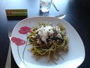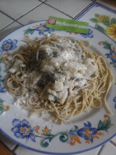 « Si vous aimez, dans la pure tradition de la recette, des pâtes à la carbonara, vous pouvez ajouter un œuf cru dans sa coquille au milieu du nid pâtes/légumes. »