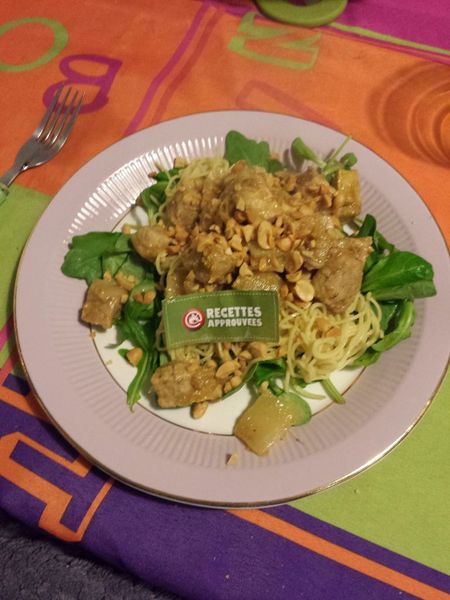 Recette claire et simple à faire. J'ai oublié les nouilles chinoises, donc j'ai opté pour des spaghettis (avec l'accord de Solange). nous avons trouvé la recette bonne mais le porc était un peu sec. Les plus du plat, c'est la présence de la cacahuète et l'association salade et pâtes.