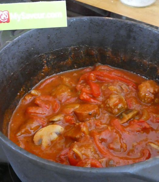 J'ai mixé des tomates pelées pour avoir du coulis. Très bon plat, bien relevé avec le piment mais le chorizo ne s'est pas ressenti. Les poivrons sont vraiment bons avec. J'ai séparé les champignons à cause des allergies.
