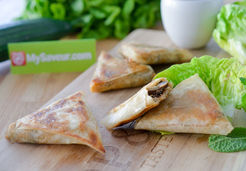 Coupez les feuilles de brick en deux et fourrez-les à l'aide de votre mélange en formant de petits triangles.