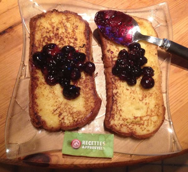 Excellent. Rien à redire à part que ça aurait été meilleure si les tranches avaient caramélisées. Mais tellement bon comme ça, le goût des myrtilles va très bien avec le pain perdu. Bref nous avons adoré.