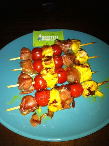 Mettre sur le pic à brochette, un cube de filet de dinde ou poulet, une tomate cerise, le fromage enroulé de jambon, puis un autre morceau de filet.