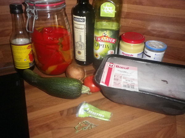 - 300 g de viande de bœuf à brochettes (en cubes) 60 g de sauce soja 50g d’huile 20g de vinaigre balsamique 1 càc de moutarde Thym, poivre Légumes : 1 tomate, ½ poivron rouge, 1 oignon, 1 courgette