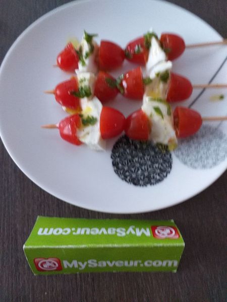 Prendre les cure-dents et confectionner vos brochettes, une moitié de tomate cerise, un cube de mozzarella, une moitie de tomate, renouvelez l’opération pour confectionner toutes les brochettes.