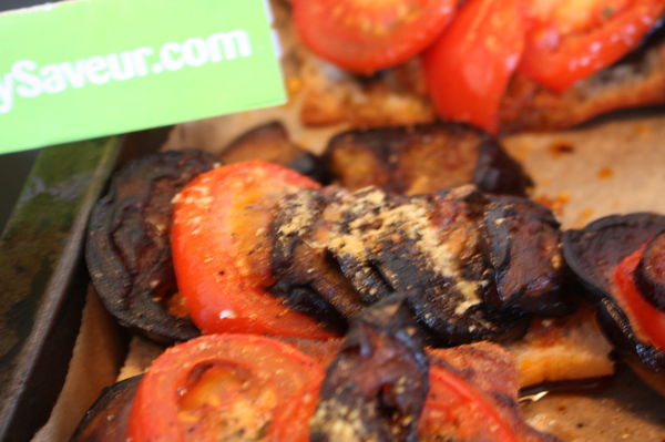 Tartiner chaque morceau avec 1 càc de pesto. Recouvrir chaque morceau en alternant tranches d'aubergine et de tomate.