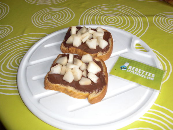 Très bon, les poires macérées sont très bonnes et donnent de la fraîcheur à la tartine. L'association nutella, poire brioche est parfaite. J'en ai mangé 2 lol !!! Gourmande !!!