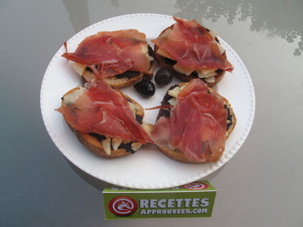 Une bruschetta simple mais efficace ! N'étant pas fan de parmesan, je n'en ai pas mis beaucoup et du coup, je n'ai pas senti le goût (mais c'est un problème de dosage de ma part). La jambon et la tapenade se marient très bien, c'était très bon.
