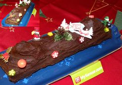 Poser la bûche sur le plat de service et placer au freezer pour 1 heure. Après ce temps, sortir le gâteau, dérouler le papier aluminium, couper les deux extrémités, sortir la crème de décoration réservée et l'étaler sur la bûche en décorant avec les dents d'une fourchette. Poser les deux extrémités dessus pour former les nœuds d'une bûche, couvrir de crème au chocolat également et décorer avec des sujets de Noël et du sucre glace.