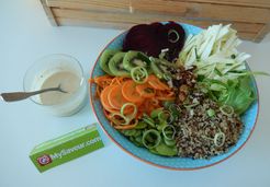 Disposer harmonieusement le quinoa, la carotte râpée, la betterave coupée en carpaccio, le kiwi coupé en fines rondelles, les fèves, le chou blanc coupé en lanières et au centre, les noix grossièrement hachées.