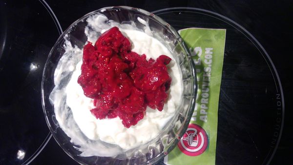 Coupez la burrata en morceaux et servez-la avec la sauce à la framboise.