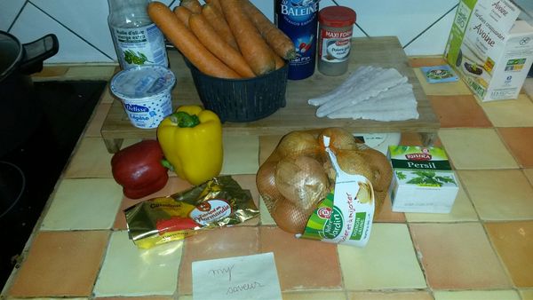 Vraiment pas convaincue. Pour moi, il manque des indications. En effet, j'ai tenté de deviner comment couper les poivrons et au final, j'ai trop mixé. Le gros souci est la quantité de carottes. celle indiquée ne rentrait pas dans le panier. J'ai dû donc en mettre moins et au final, si les goûts sont bons, le plat est déséquilibré trop de carottes et pas de féculents qui pourrait rééquilibrer la chose. Je ne retenterai pas.