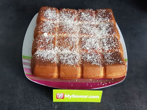 Pour moi le gâteau n'est pas assez citronné, le sucre l'emporte trop. Il est aussi trop huileux à mon goût... J'ai aimé le fait de badigeonner de confiture et saupoudrer de noix de coco qui va bien avec le citron.