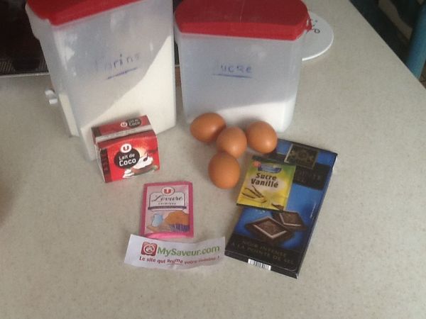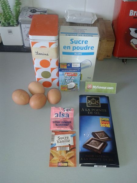Lorsque le chocolat est fondu, retirez le récipient du feu, incorporez le lait de coco et mélangez bien. Versez le mélange dans la pâte œuf/sucre/farine et mélangez à nouveau.