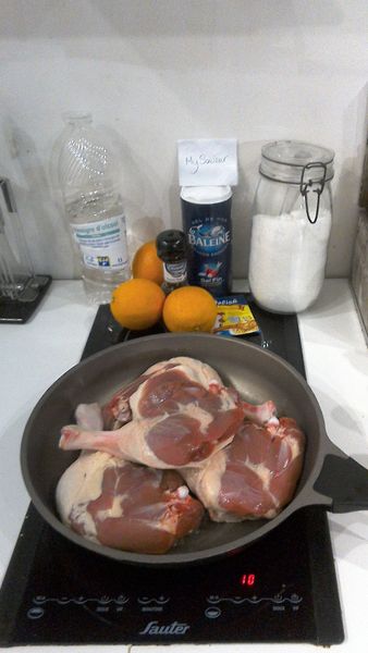 Enlever la graisse de la cocotte colorer les tranches d'orange (facultatif, et les morceaux d'oignons). Ajouter le sucre, le vinaigre, et caraméliser. Déglacer ensuite avec le jus d'orange.