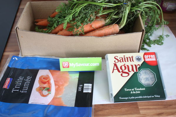 À la sonnerie, vider l'eau, mettre les carottes dans le bol, le St Agur, le saumon coupé en morceau : 5min/mijo/sens inv/100°.