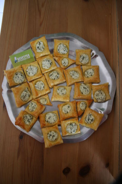 Réalisée avec une pâte feuilletée maison. Sympa, ça change pour l'apéro. Appréciés, mais je pense essayer avec de la bûche de chèvre la prochaine fois, pour un goût un peu plus prononcé de chèvre.