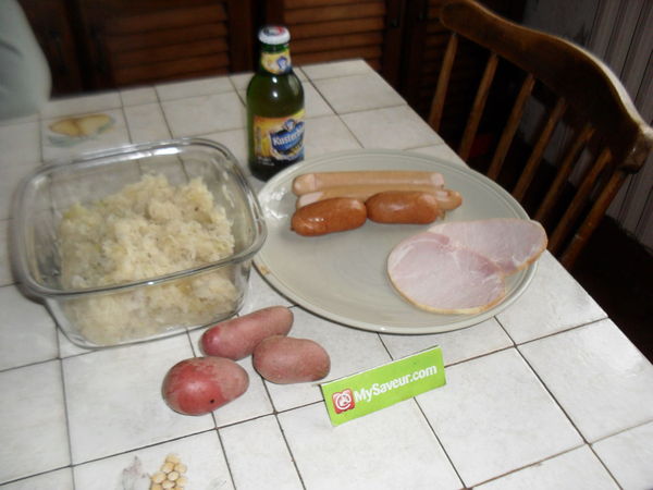 « Vous pouvez déguster ce plat avec un petit vin blanc d’Alsace ou une bière. Il est possible de le manger avec de la moutarde, ou de la mayonnaise pour certaines personnes. Je n'ai pas assaisonner car les saucisses ont salé le plat, et que dans mon chou il y avez déjà du poivre.