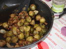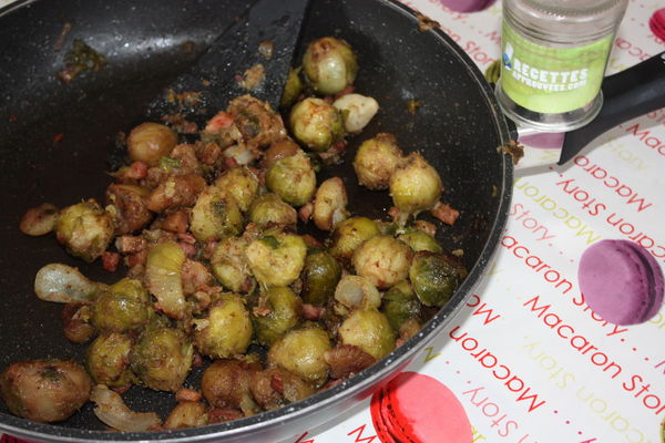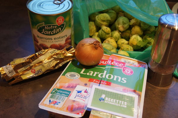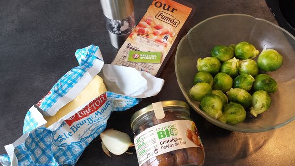 J'adore les choux de Bruxelles simplement poêlés avec des lardons, mon conjoint beaucoup moins. Je trouve que les marrons n'apportent rien, à part du sec. J'ai multiplié les quantités par deux afin d'obtenir un plat complet et unique.