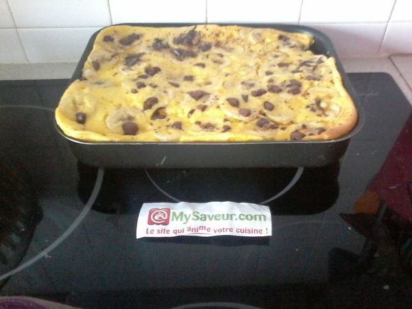 J'ai diminué les proportions pour 2 personnes. Un bon clafoutis, la pâte est bonne et le mariage de la banane et du chocolat est toujours parfait.