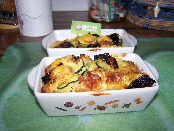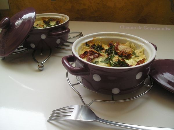 Je suis désolée mais ce plat n'a pas été une réussite du tout chez nous. J'ai commencé à dresser dans des ramequins du genre de la photo, mais je ne pouvais quasiment rien mettre dedans des ingrédients. J'ai opté pour mon plat à clafoutis qui est pour 2 personnes, mais du coup pas assez d'appareil. Les tomates séchées auraient méritées d'être confites, là elles étaient dures. Les courgettes n'ont pas cuits contrairement au reste du plat. Seul point positif : la découverte du Chaume...