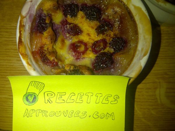 Clafoutis très bon, par contre, pour le bol de mûres et de framboises, j'ai dû en mettre de trop, du coup il n'y avait pas beaucoup de pâte. Je n'ai pas mis l'alcool car c'était pour le goûter des petits. J'ai dû le cuire 10min de plus pour une belle coloration. L'association mûres-framboises est sympa, sucré et "amertume" se marient bien, la mûre seule ne m'aurait pas plu du tout.