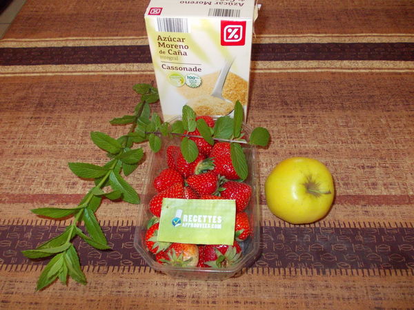 La quantité de menthe aurait dû être mieux précisée, car j'ai utilisé cinq branches comme indiqué mais elles étaient sûrement trop fournies en feuille car le goût la emporté sur celui de la fraise et la pomme. A refaire en réduisant la quantité de menthe.