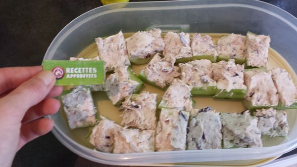 Il faut vraiment un tout petit oignon si on le met entier ! Sinon le mélange était bon, mais la façon de couper le concombre fait que celui-ci domine en goût. Ça fait de gros morceaux en bouche, je n'ai pas trop aimé. Je préfère les bâtonnets à tremper.