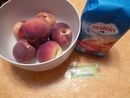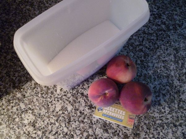 La veille au soir : couper les pêches en petits morceaux et les mettre dans un plat recouvert de sucre.Recouvir le plat soit du couvercle ou un torchon.