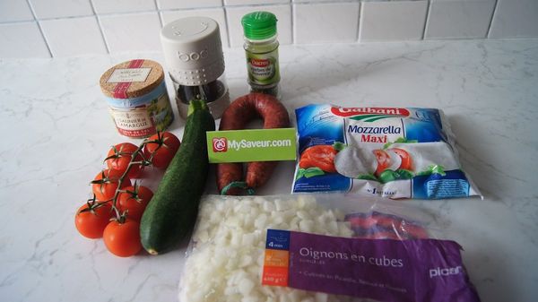 Couper les tomates, oignon, chorizo fort et mozzarella en rondelles.