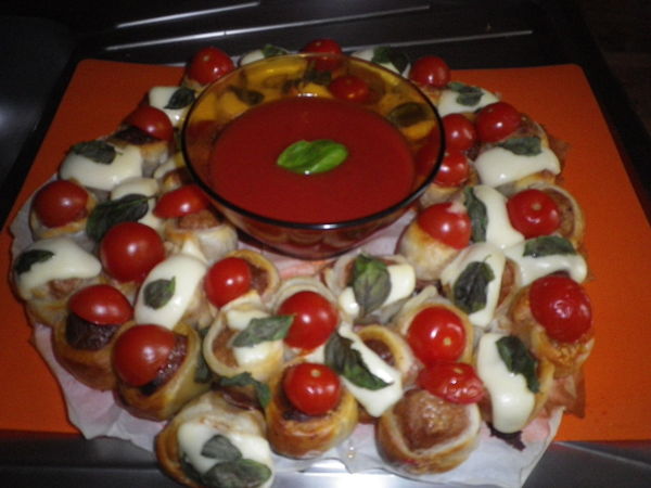 Cuire 10 min (ou plus selon four et grosseur des boulettes) à 180°C. Mettre la sauce tomate au centre et déguster avec les doigts en trempant les boulettes dans la sauce tomate.