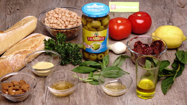 Pour la salade : égouttez et rincez les haricots blancs. Coupez les tomates (fraiches et séchées), émincez l'oignon. Mélangez délicatement les tomates avec les haricots, les herbes fraiches ciselées, les olives coupées en rondelles, l'oignon et les amandes. Versez la vinaigrette.