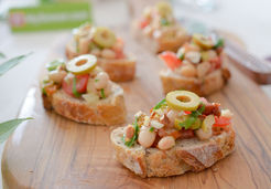 Arrosez d'un filet d'huile d'olive et disposez la salade de haricots blancs sur le dessus. Terminez avec de la vinaigrette aux olives.