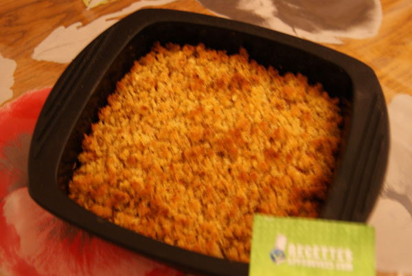 Très bonne recette mais j'augmenterai la quantité des ingrédients pour la pâte à crumble la prochaine fois. Pour celle-ci, par manque de biscottes au moment de la préparation, je les ai remplacées par des gressins écrasés (restant d'un précédent test...)et ça a fait l'affaire.