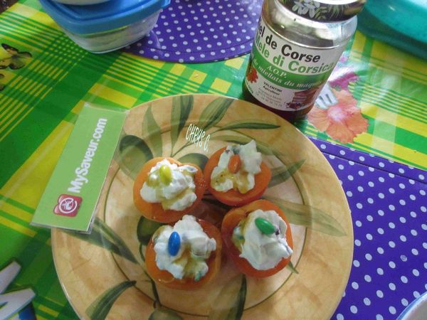Couper les abricots en 2 et les garnir avec le mélange de brocciu et mettre 1 M&M's sur le dessus.