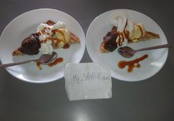 Disposez sur chaque triangle une boule de glace au chocolat noir puis mettre un peu de chantilly et enfin une boule de glace vanille.