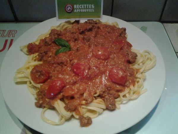 Recette facile à faire. Nous avons eu l'impression de manger une bolognaise. L'usage des tomates cerises n'apporte pas un plus par rapport à ma recette habituelle (j'utilise des tomates normales). L'avantage de cette recette c'est sa rapidité de cuisson car la notre on la laisse mijoter au moins 2h.