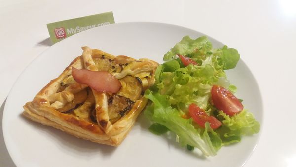 Couper les 2 tranches de bacon restantes en 2 et les mettre au four quelques min en même temps que les feuilletés pour en faire des chips. Les sortir quand elles commencent à sécher, il faudra les poser sur les feuilletés à l’issue de la cuisson.