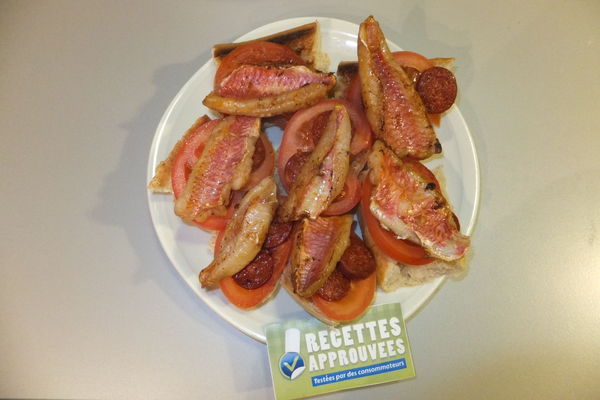 J'ai souvent fait des toasts pain/tapenade/rouget qui sont très bons. J'ai découvert avec cette recette une nouvelle association très bonne à refaire ! Le chorizo apporte du pep's au rouget. Pour ma part une seule tomate et 1/2 chorizo suffisent.
