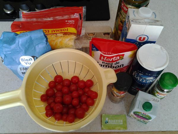 - 200 g de dés de jambon (ou jambon en morceaux, restes de viandes, saucisses de Strasbourg ...)
