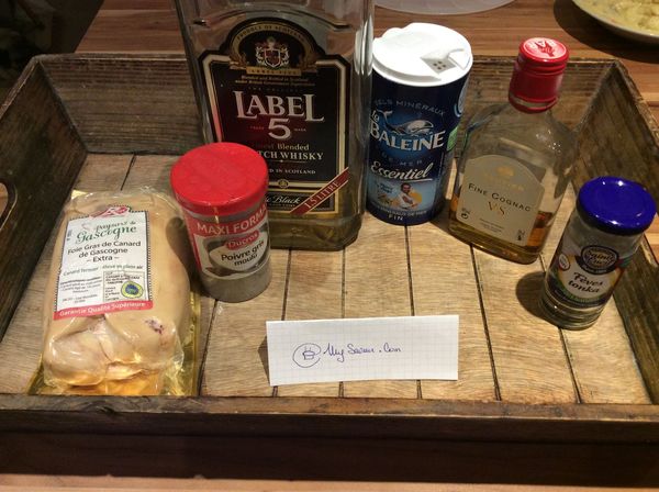 Mettre 2 bouchons de cognac et 2 bouchons de whisky sur le foie gras disposé sur un film alimentaire.