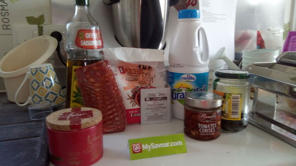 Ajouter la farine, l'eau, l'huile d'olive, le sel. Pétrir 2min30 afin d'obtenir une pâte souple et élastique, ajouter les olives et le chorizo coupé en rondelles.