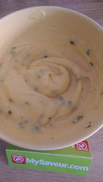 Faire la mayo bravas : mélanger le jaune d'oeuf avec la moutarde, le sel et le poivre. Monter à l'huile. Mettre le vinaigre à la fin.