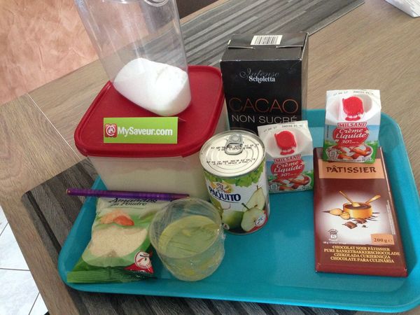 Pour le montage, mettre le biscuit dans un plat de service, ajouter le cercle (moule amovible pour faciliter le démoulage) et mettre la moitié de la mousse au chocolat. Ajouter les lamelles de poires et le reste de mousse. Décorer à votre guise puis mettre au frigo.